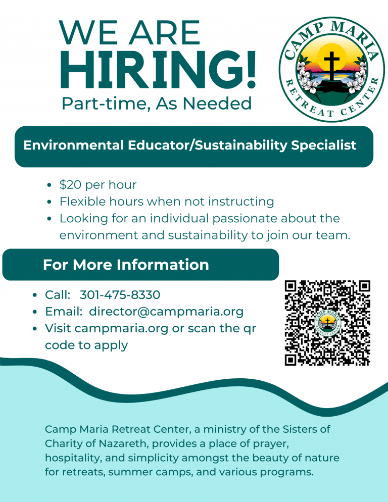 Camp Maria Retreat Center, a ministry of the Sisters of Charity of Nazareth, strives to provide an atmosphere of prayer, hospitality and simplicity in a peaceful, natural environment for retreats and various types of renewal programs. Our facilities are available to those who seek to strengthen and deepen their commitment to God, the Church, and to God’s people throughout the world.